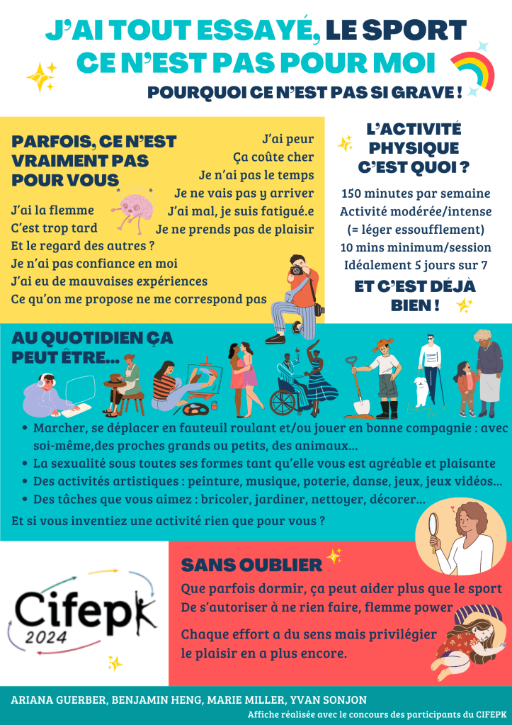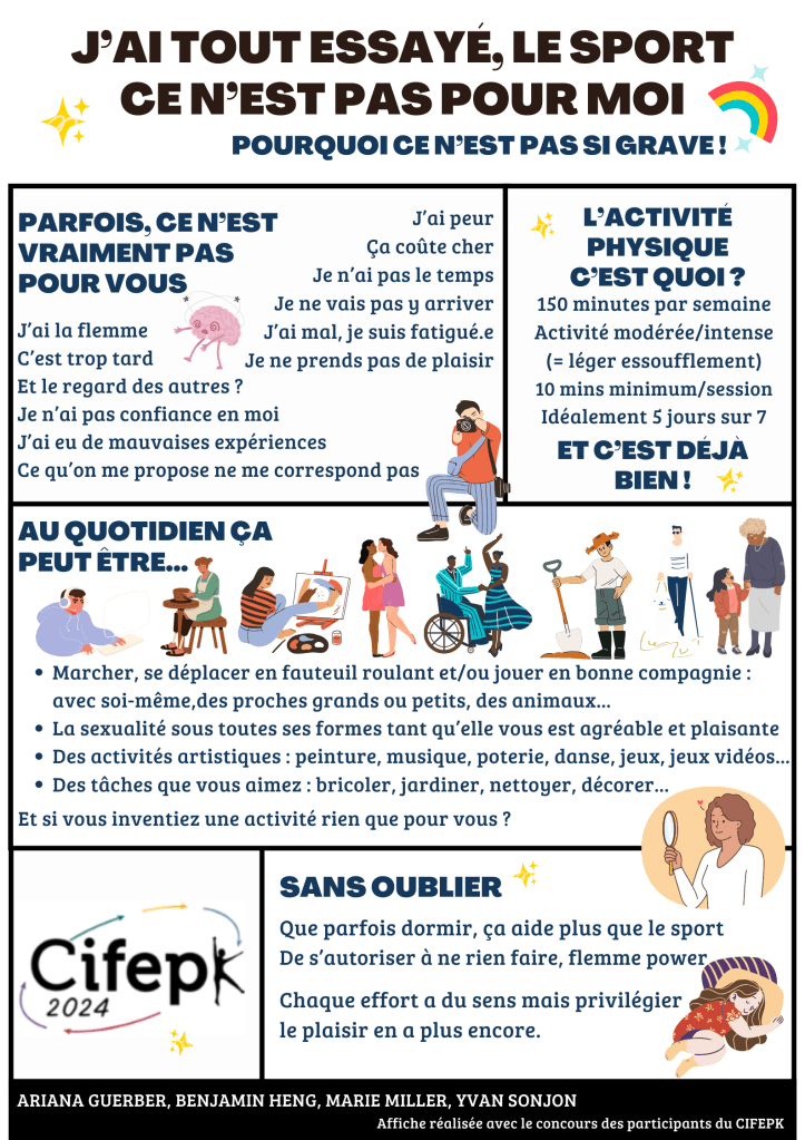 Ci-dessous les visuels produits par Marie avec Ariana Guerber, Benjamin Heng et Yvan Sonjon dans les suites d’un groupe de travail du même nom lors de l’édition 2024 du CIFEPK. Ils sont disponibles en PNG et PDF. N’hésitez pas à diffuser ces visuels, les afficher dans vos salles d’attentes ou proposer à vos soignant.e.s d’en faire la promotion.